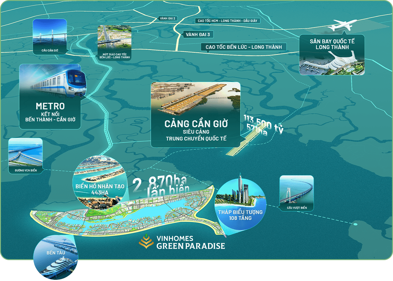 Green Paradise Cần Giờ đang bước vào giai đoạn bứt phá với 6 dự án hạ tầng trọng điểm đồng loạt triển khai, mở ra tương lai kết nối toàn cầu. Từ cầu Cần Giờ, đường sắt cao tốc 350 km/h đến đường vượt biển, cảng quốc tế hiện đại… tất cả đang định hình siêu đô thị biển ESG++ xanh – thông minh – sinh thái – tái sinh hàng đầu thế giờ.